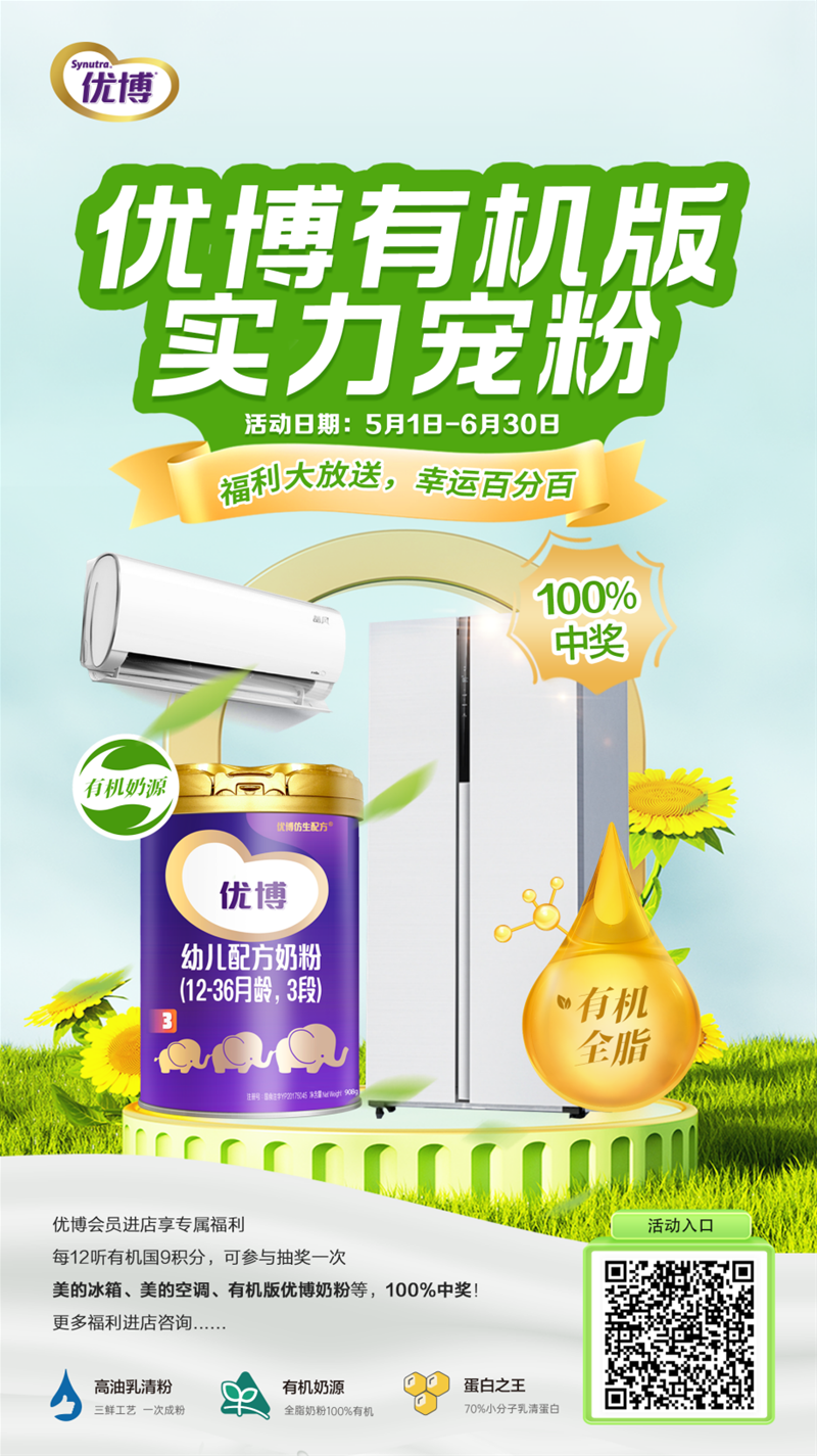 优博有机板新品的推出,对于消费者与渠道市场来说何尝不是一个“福音”:在新品推出同时,开展“实力宠粉”活动,购买@圣元优博官方账号优博有机奶源版奶粉(908g),积分可抽奖。既满足了新生代消费者品质化、精细化、高端化的需求,也为渠道商带来了新的生意增长机会,缓解存量奶粉动销难度陡增的困局,助力渠道客户挖掘细分品类的潜力。